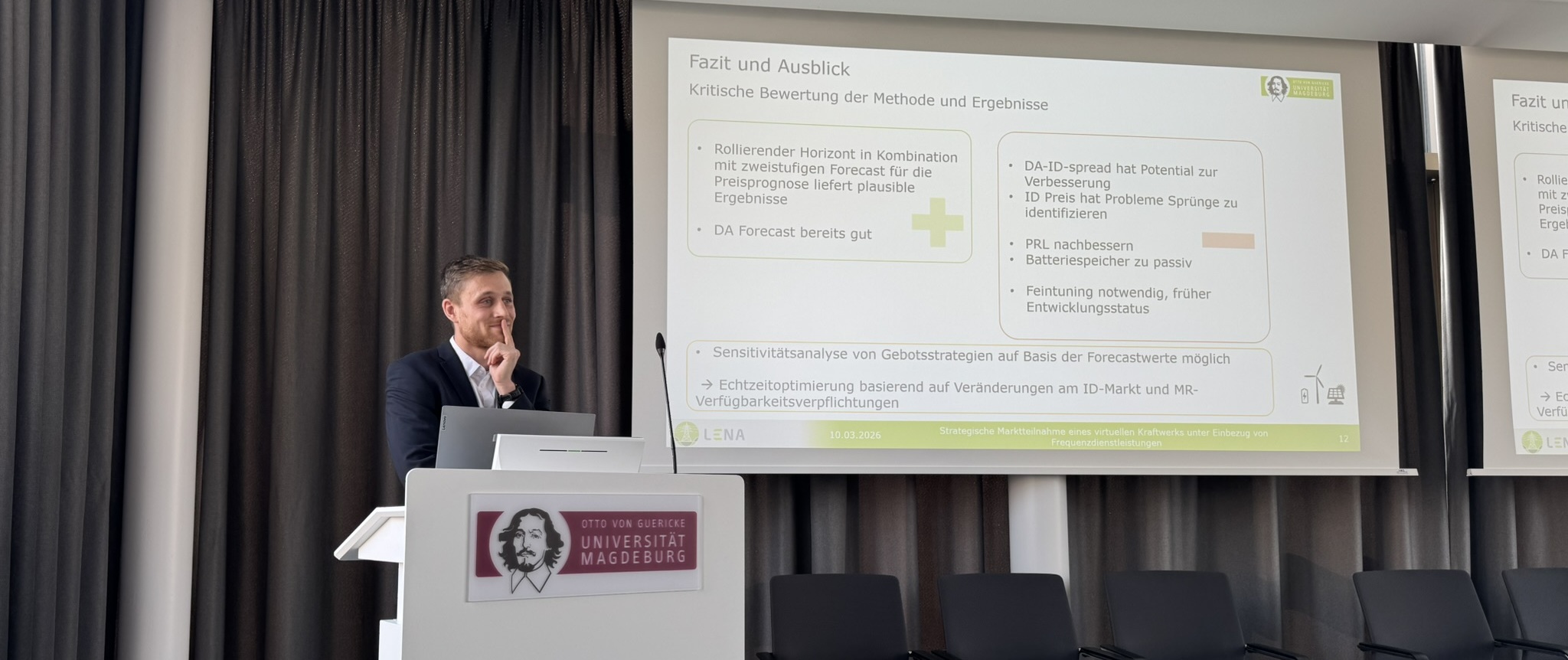 Christoph Sauer hat das Thema "Strategische Markteilnahme eines virtuellen Kraftwekrs unter Einbezug von Frequenzdienstleistungen" vorgesetllt. In dieser Arbeit geht es um die Optimierung des Anbieterverhaltens auf Basis selbst erstellter Preisprognosen des Folgetages der relvanten Märkte. Darüberhinaus wird anhand dessen die Martteilnahme erstellt und am Liefertag laufend angepasst und optimiert. Berücksichtigt wird außerdem die Bereitstellung von Momentanreserve und Primärrgelleistung.