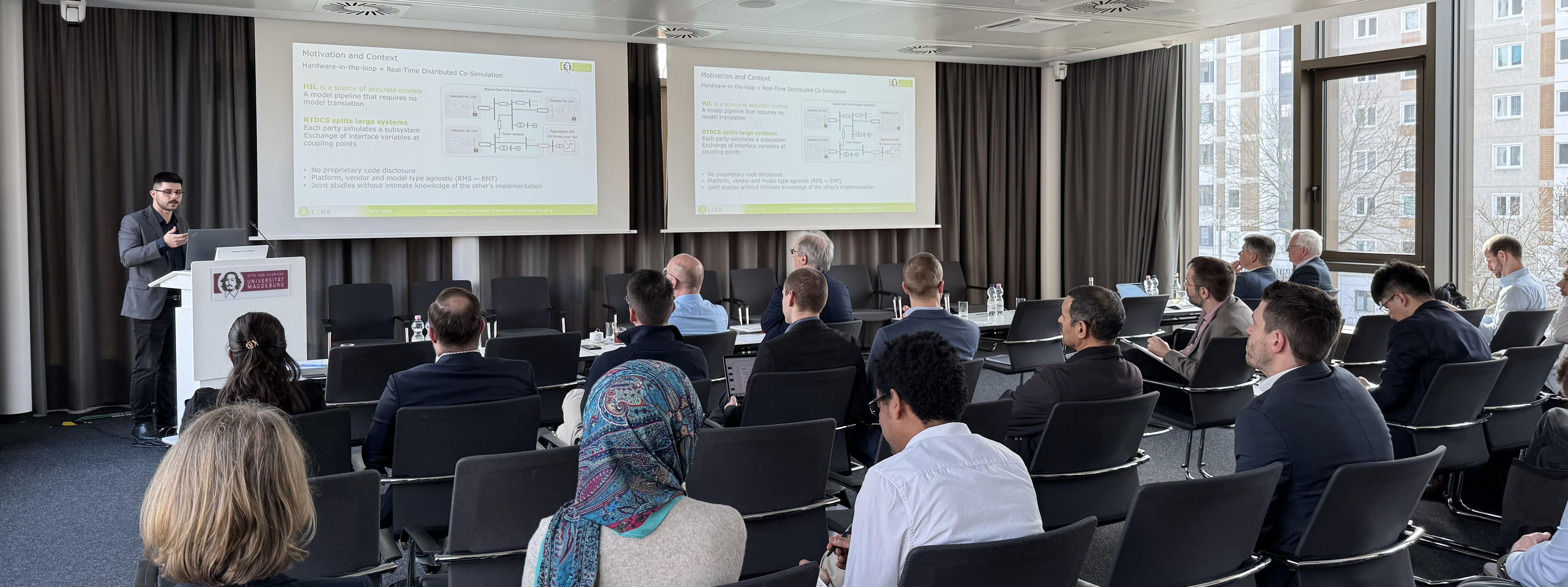 João Scherer Cipriani stellte das Thema "Distributed Real-Time Simulation of Power Systems with High IBR Participation: Transmission Line Based Coupling" vor. In diesem Beitrag geht es um ein Rahmenkonzept für die Kopplung von Übertragungsleitungen, das der verteilten Echtzeitsimulation von Stromnetzen mit hohem Anteil an IBR-Anlagen dient. Durch den Einsatz rationaler Anpassungen im Frequenzbereich und die Durchsetzung der Passivität gewährleistet die Methode Stabilität bei moderaten Latenzen und überwindet gleichzeitig die physikalischen Längenbeschränkungen herkömmlicher Bergeron-Modelle. Dies ermöglicht präzise, plattformunabhängige HIL-Studien sowie die nahtlose Integration proprietärer Black-Box-Modelle in verschiedene Echtzeitsimulationsumgebungen.