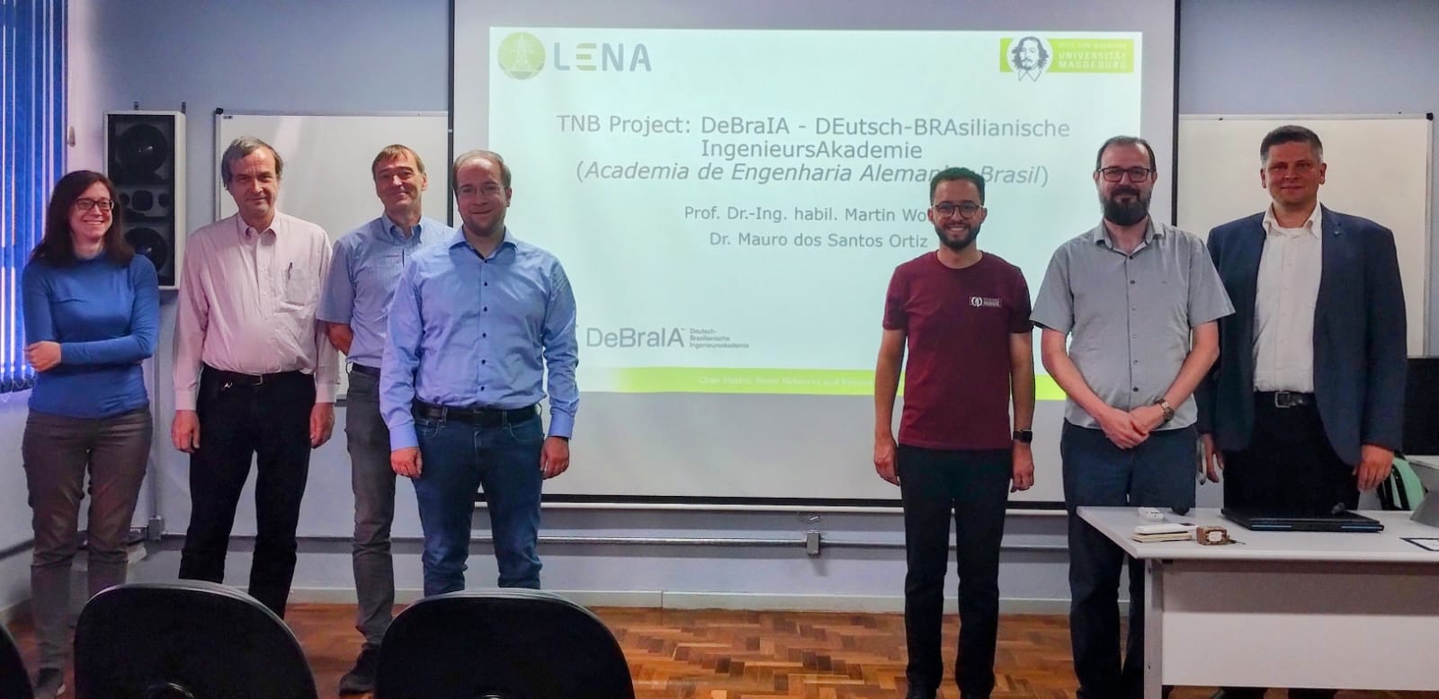 A delegation from Otto von Guericke University Magdeburg, consisting of Prof. Andreas Lindemann, Prof. Fabian Lurz, Prof. Martin Wolter, Dr.-Ing. Mauro dos Santos Ortiz (coordinator of the DeBraIA program), Prof. Dr.-Ing. Nicole Gehring, and Prof. Dr.-Ing. Ralf Vick, visited the Universidade Federal de Santa Maria (UFSM) in Brazil at the beginning of November 2025. The focus of the working week was on deepening the strategic partnership in the field of electrical engineering and consolidating the joint double degree master's program between the Faculty of Electrical Engineering, Information Technology and Mathematics (FEIT/OVGU) and the PPGEE/UFSM. At the beginning of the visit, professors from both universities completed the drafting of a new agreement (Specific Double Degree Agreement); the document is now being reviewed by the legal departments of both institutions.